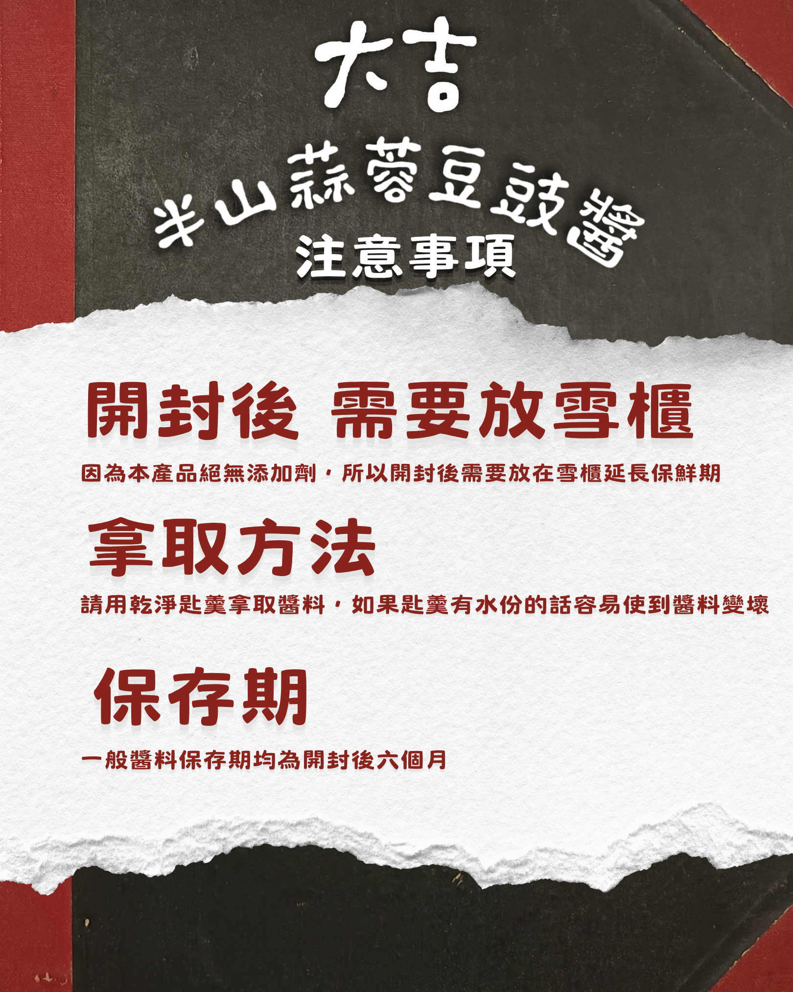 開啟前請置放陰涼處,避兔被陽光直接照射,開啟後,請放進雪櫃冷藏,請勿用沾濕的用具處理醬料。